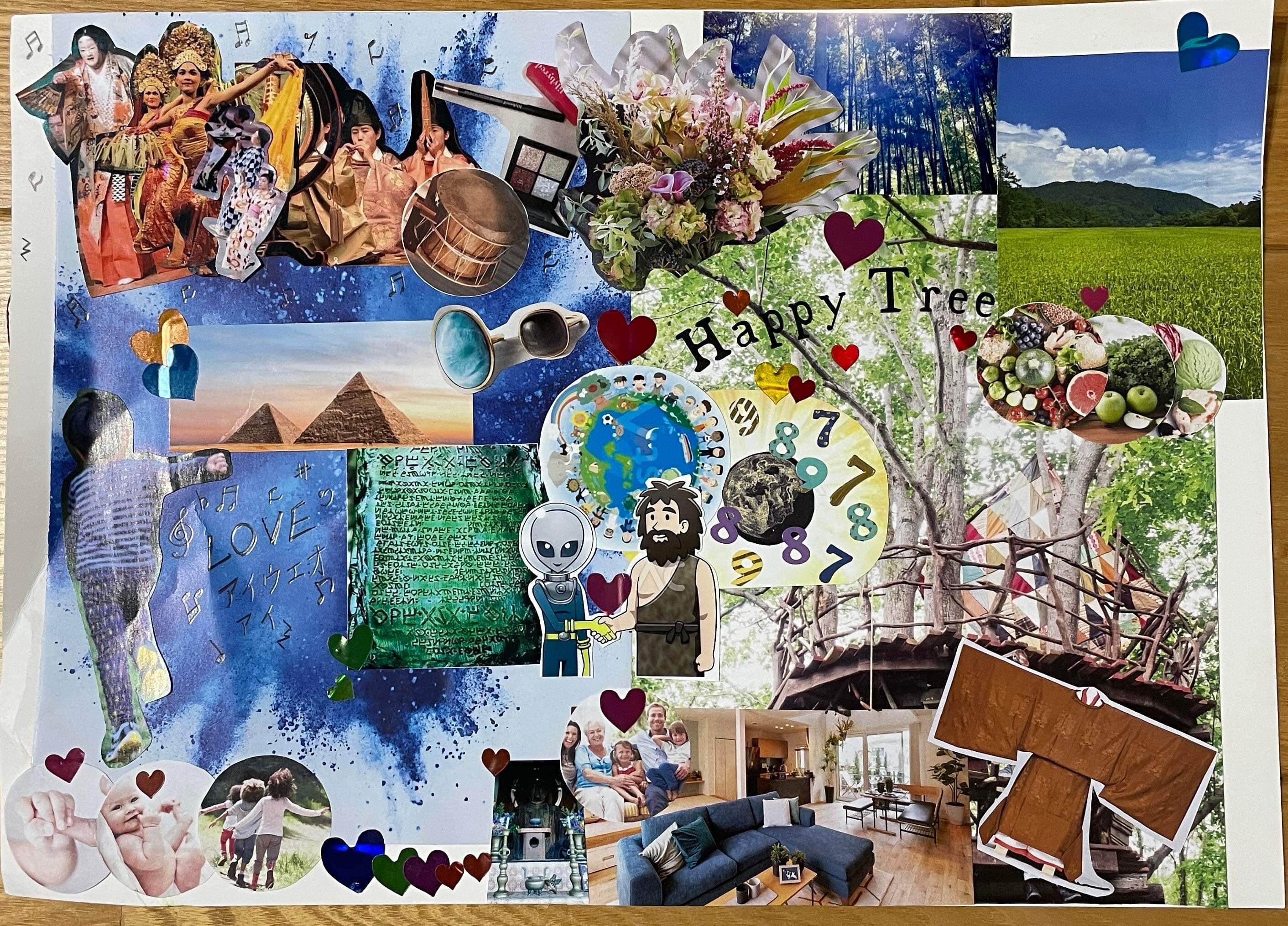 心の奥にある願いを発掘していくノートワークとヴィジョンを視覚化していくビジョンマップを制作するコラージュワークを行います。