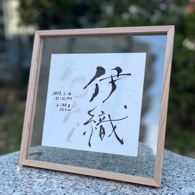 新しく地球に生を受けた命の命名式にふさわしい、 オリジナルの命名書をお作りします。 「New born calligraphy(ニューボーンカリグラフィー)」は、 書画家チエコが美しい文字で初めてのギフトである名前を 必要なエネルギーを込めて丁寧に書き上げる、上質な命名書です。 日本の伝統美を現代的なデザインに落とし込み、 お子様の名前を知らせる大切な日の思い出を一生の宝物にしてください。 また、額装も自由にお選びいただけますので、 ご自宅やお祝いの場所に合わせてお楽しみいただけます。 この特別な命名書が、あなたとあなたの大切な方々の心を心地よい感動で包みますように。 ぜひ、誕生の記念にいかがでしょうか。 ※命名書は着色・加工により、多少異なる場合があります。 また、納品までにお時間をいただく場合がありますので、ご了承ください。 ※見本写真の書の紙のサイズ25cm✖25cm ※額おまかせ、額不要の場合、書のサイズがお選びいただけます。